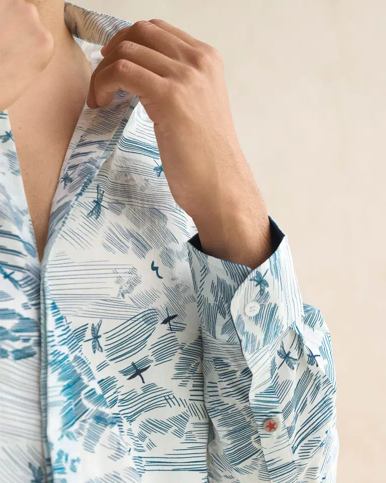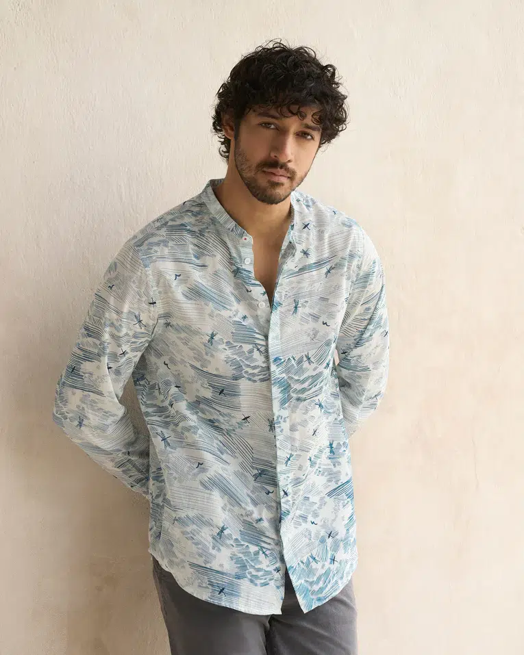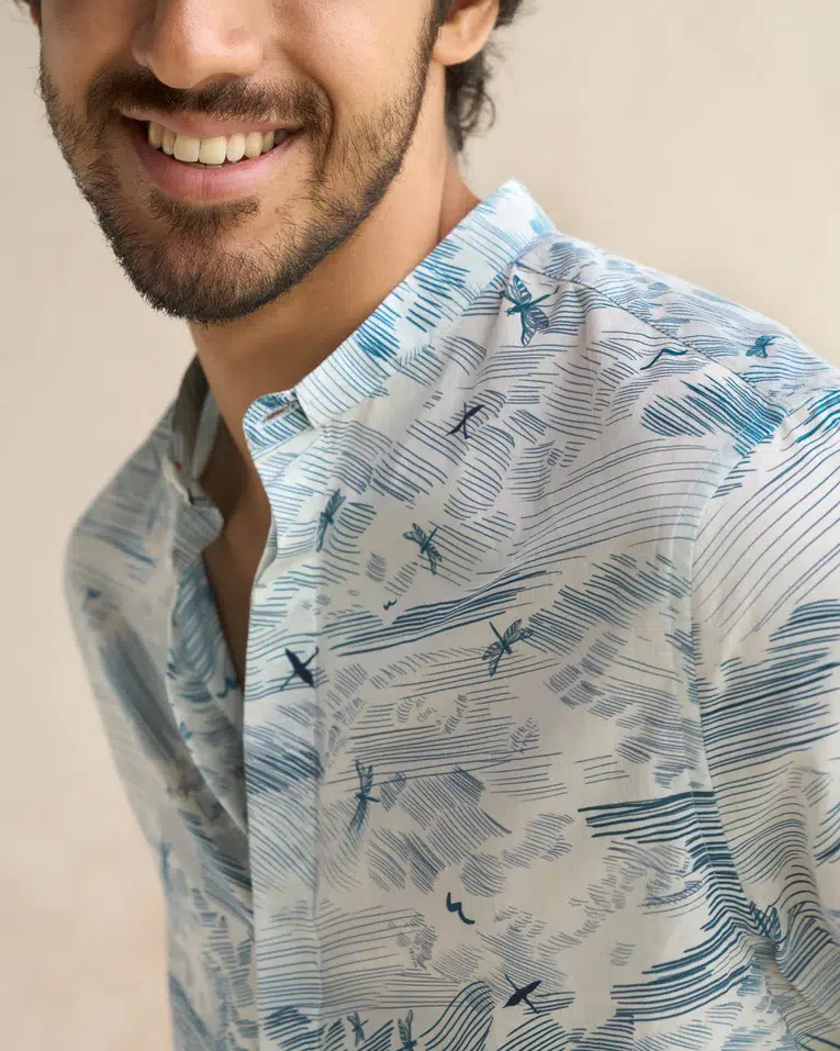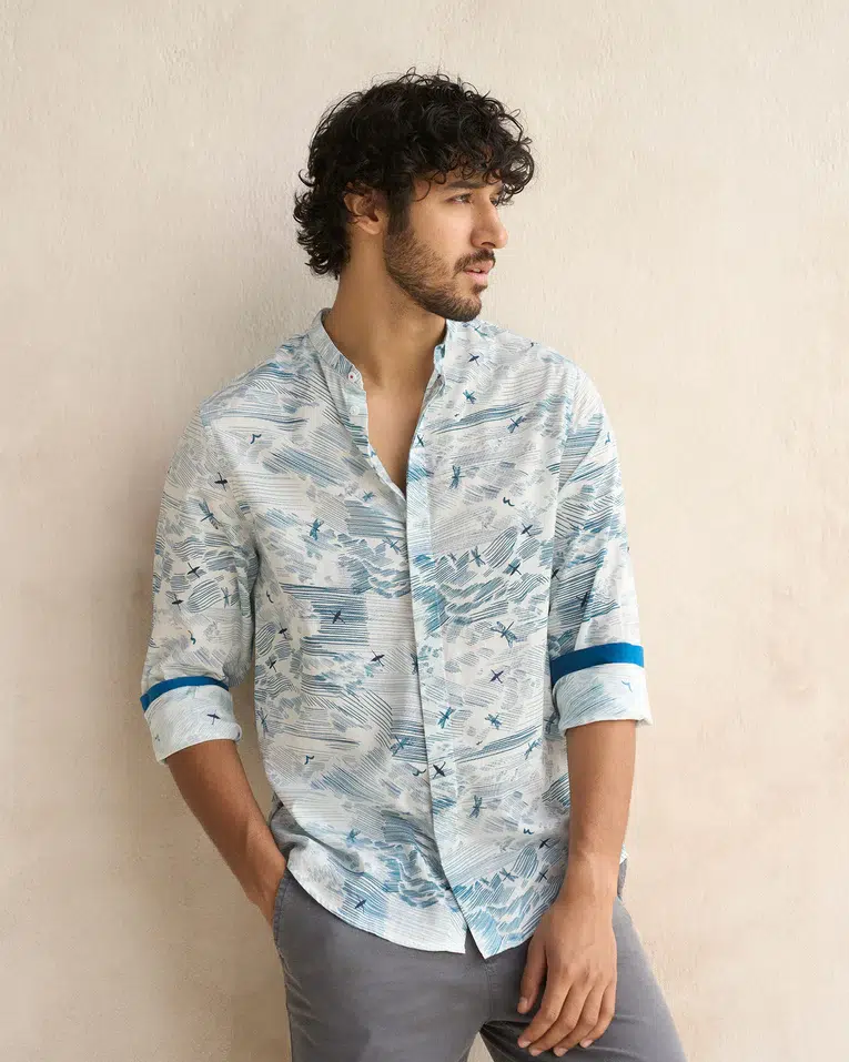 The band collar design adds a touch of modernity to the classic silhouette, elevating this shirt to a versatile piece suitable for various occasions. The ivory backdrop serves as a backdrop for subtle blue details, creating a harmonious interplay of colors that exudes understated charm.