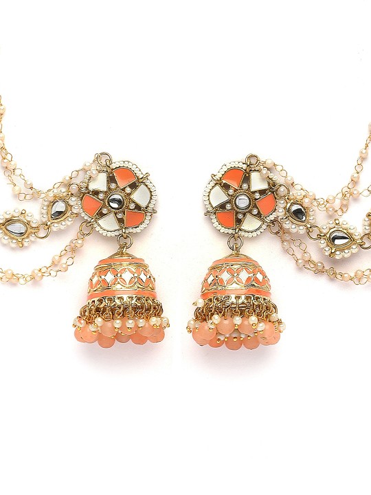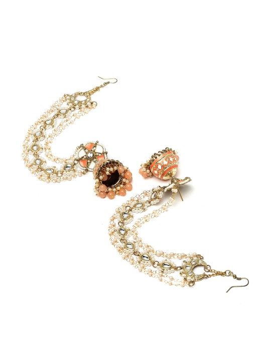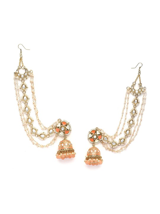 Peach-coloured contemporary jhumkas, gold-plated, has kundan