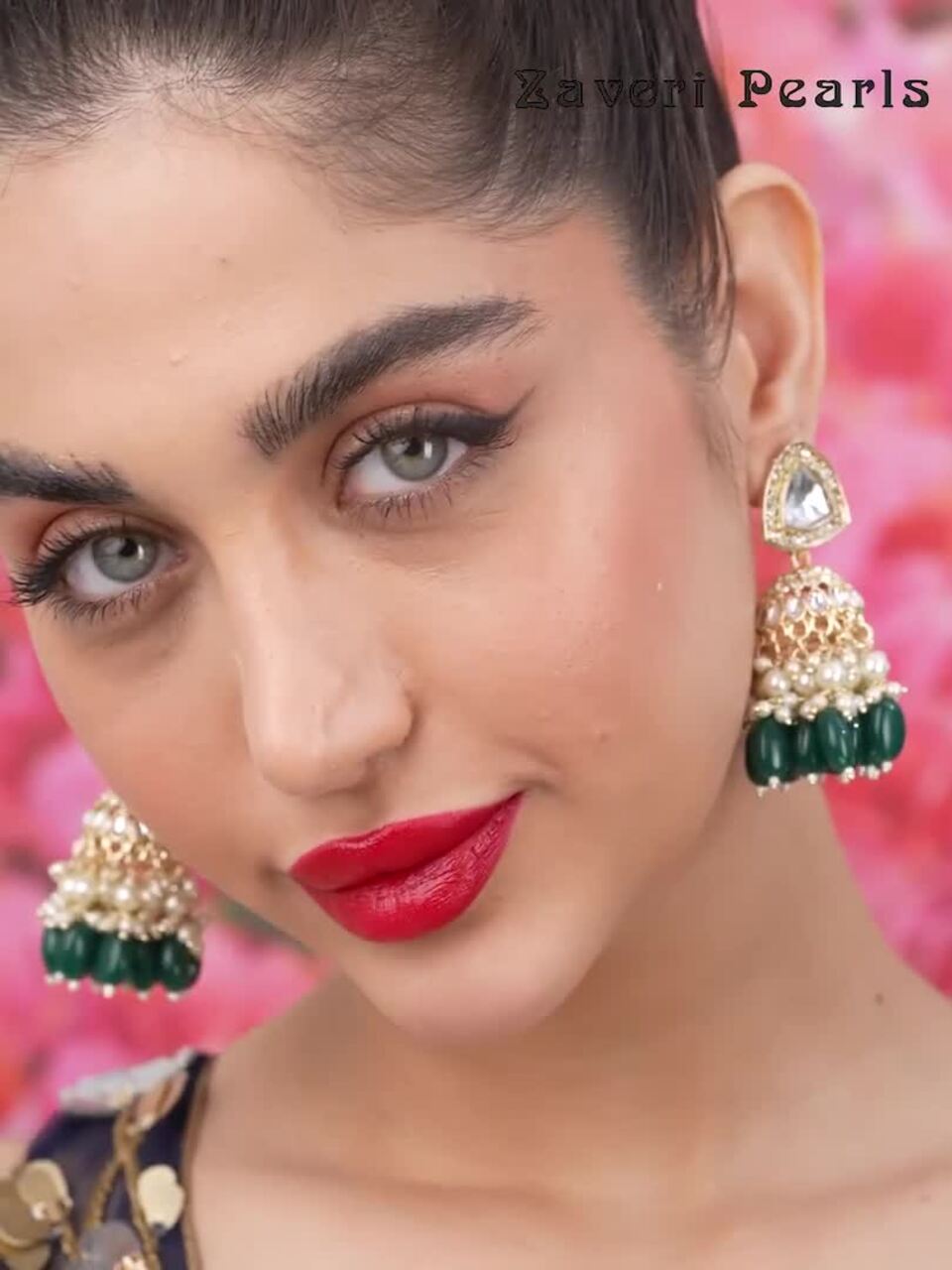 Gold-toned & green contemporary jhumkas, gold-plated, has kundan