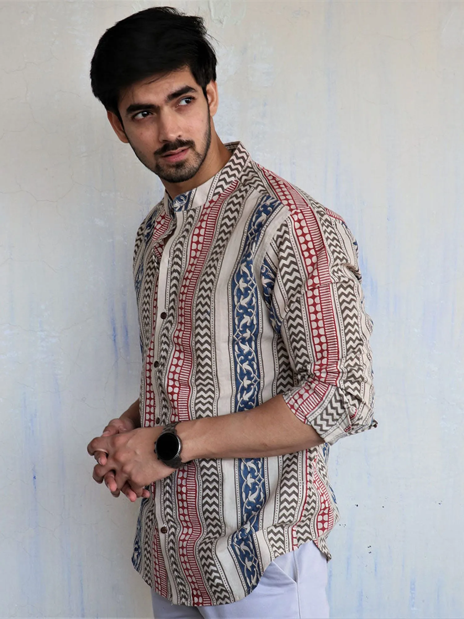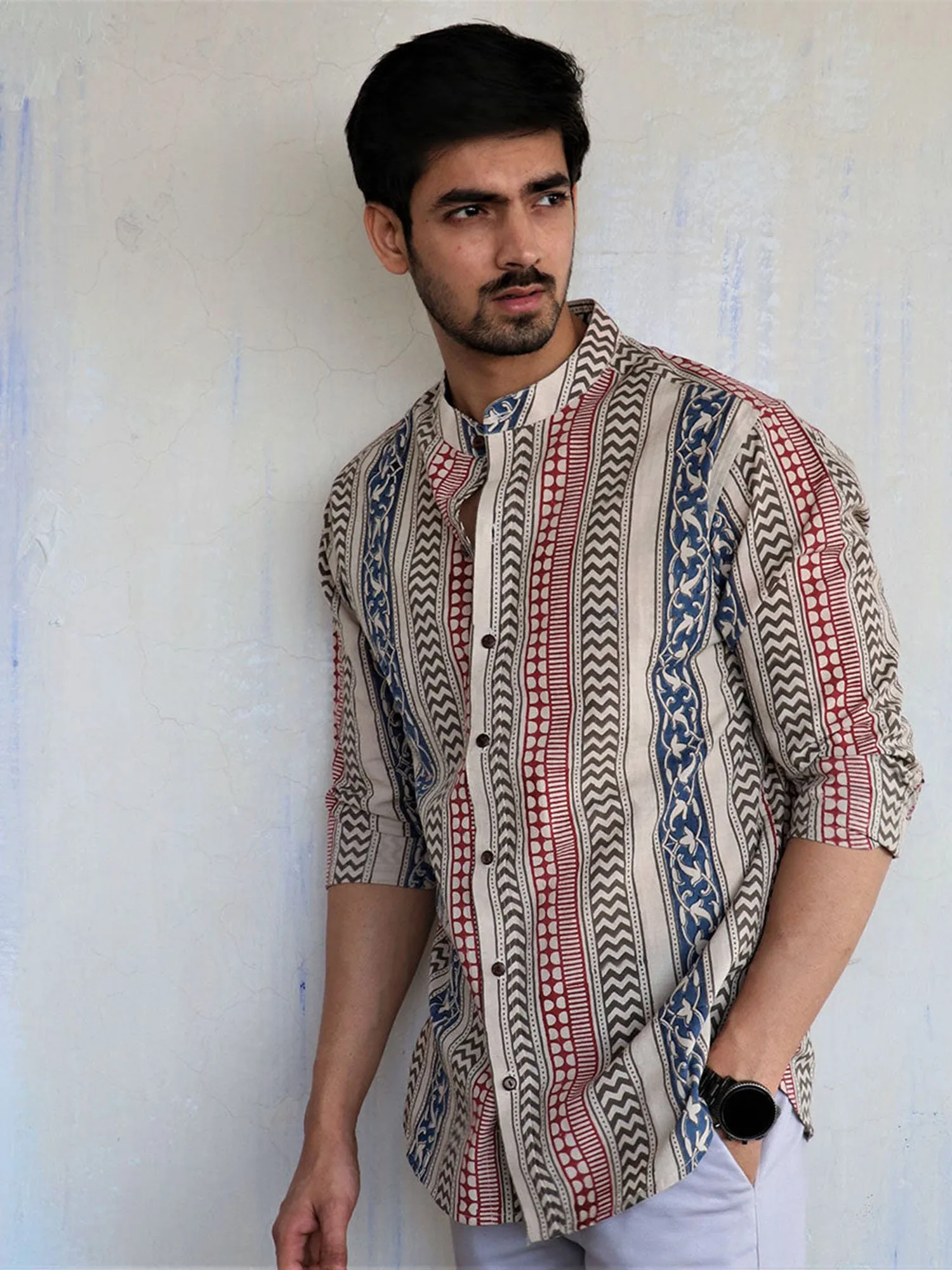 The Ivory Block Printed Men Shirt is a sartorial masterpiece that seamlessly marries classic charm with modern design. This shirt is a testament to the enduring appeal of simplicity and understated elegance.