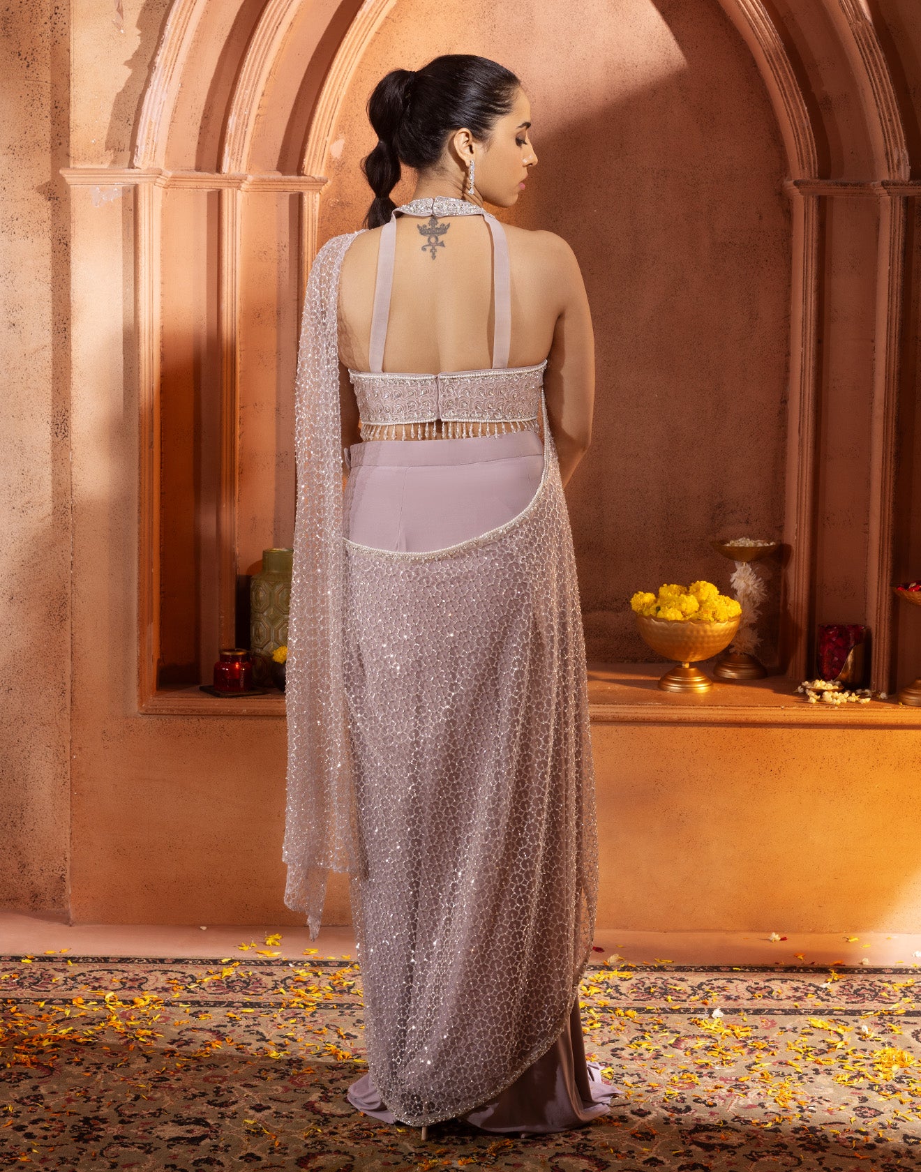 - This stunning mauve taupe embellished pre-stitched saree is a perfect blend of elegance and convenience.