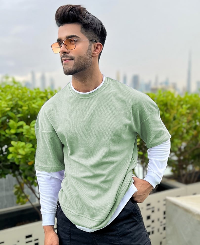 Introducing the Pista Green with White Panel Attached Oversize Drop Shoulder T-Shirt for Men, a fresh and stylish addition to your wardrobe. This t-shirt combines contemporary design elements with a touch of sophistication, offering a unique and fashion-forward look.