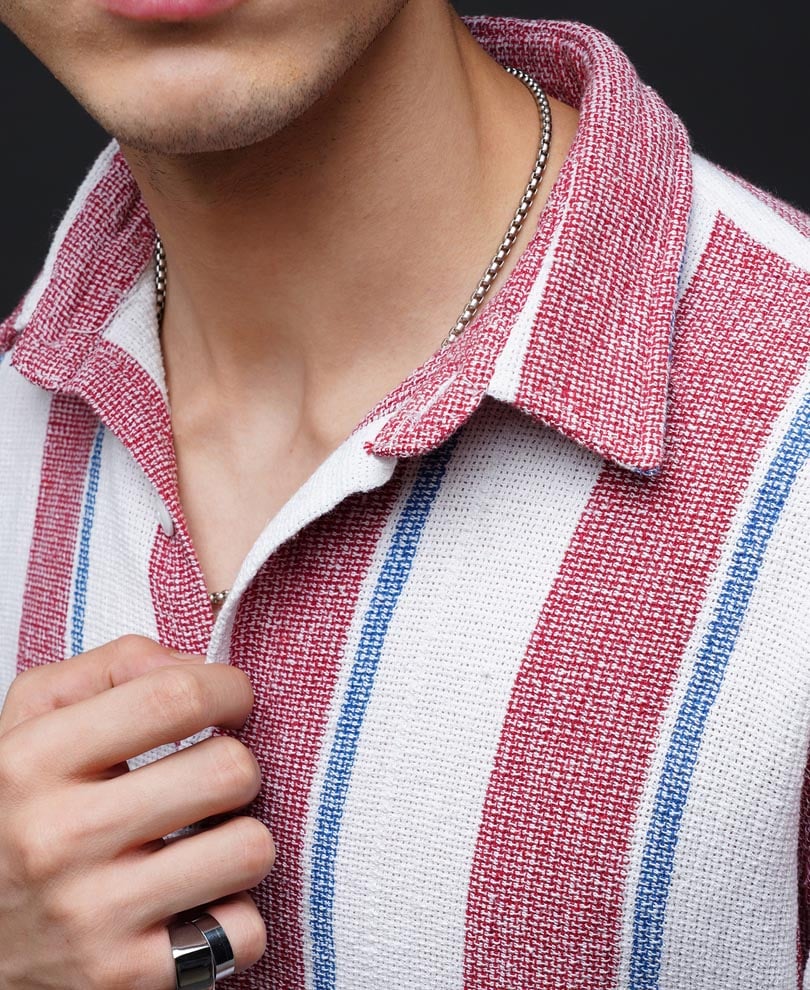 The red stripes on this shirt create a visually dynamic and attention-grabbing pattern. The contrast of the bold red against a contrasting background adds depth and visual interest to the shirt. The stripes add a sense of movement and excitement, making it a standout piece in any ensemble.