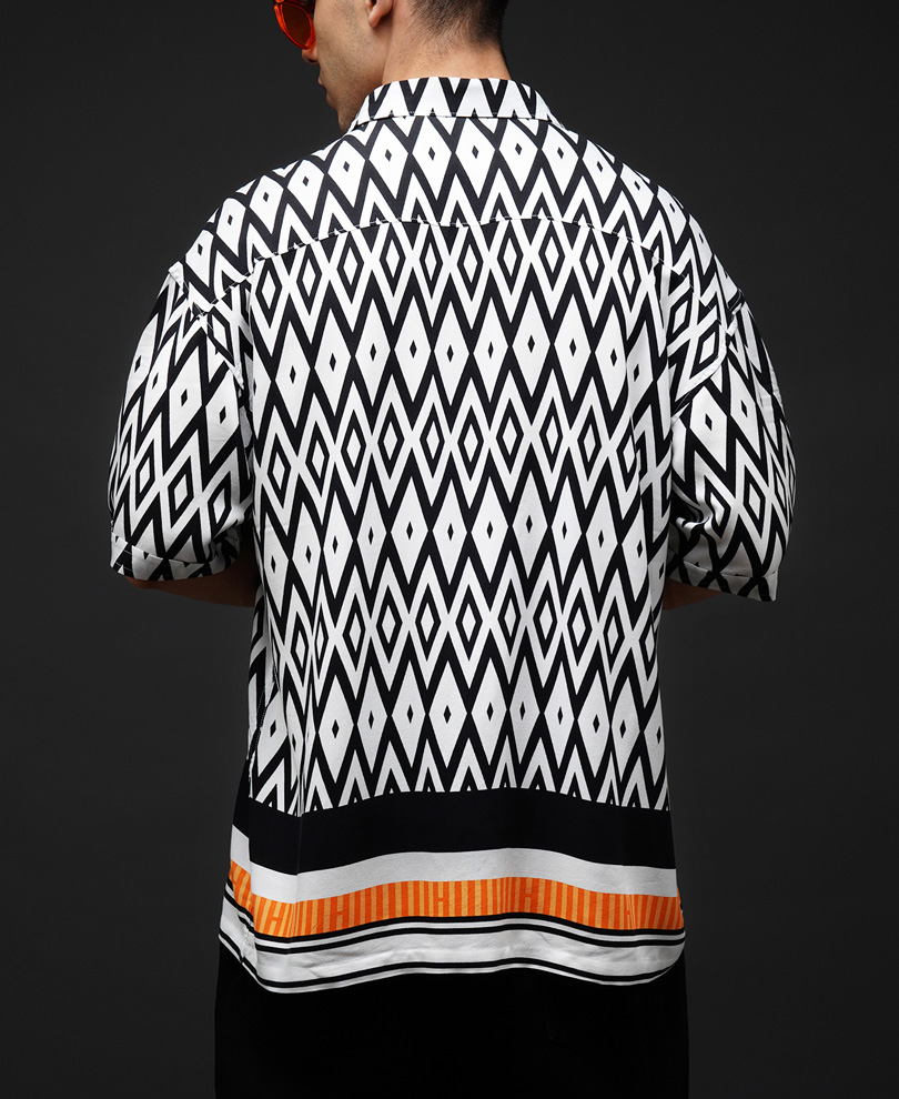 Introducing the White Geo Print Oversize Drop Shoulder Shirt for Men, a unique and fashionable piece that combines a geometric print with a relaxed and contemporary silhouette. This shirt showcases a captivating white geo print that adds a touch of modernity and style to your wardrobe.